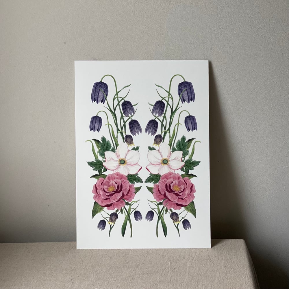 Between Seasons is a hand-painted gouache artwork, created in Lancashire and inspired by the flowers growing in my garden. The piece captures the colours and shapes of these plants as they flourish in spring and early summer.