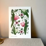 Pink Parrot Tulips & Anemone is a hand-painted gouache artwork, created in Lancashire and inspired by the tulips and anemone growing in my garden. The piece captures the shapes, colour, and movement of these spring flowers as they come into bloom.
