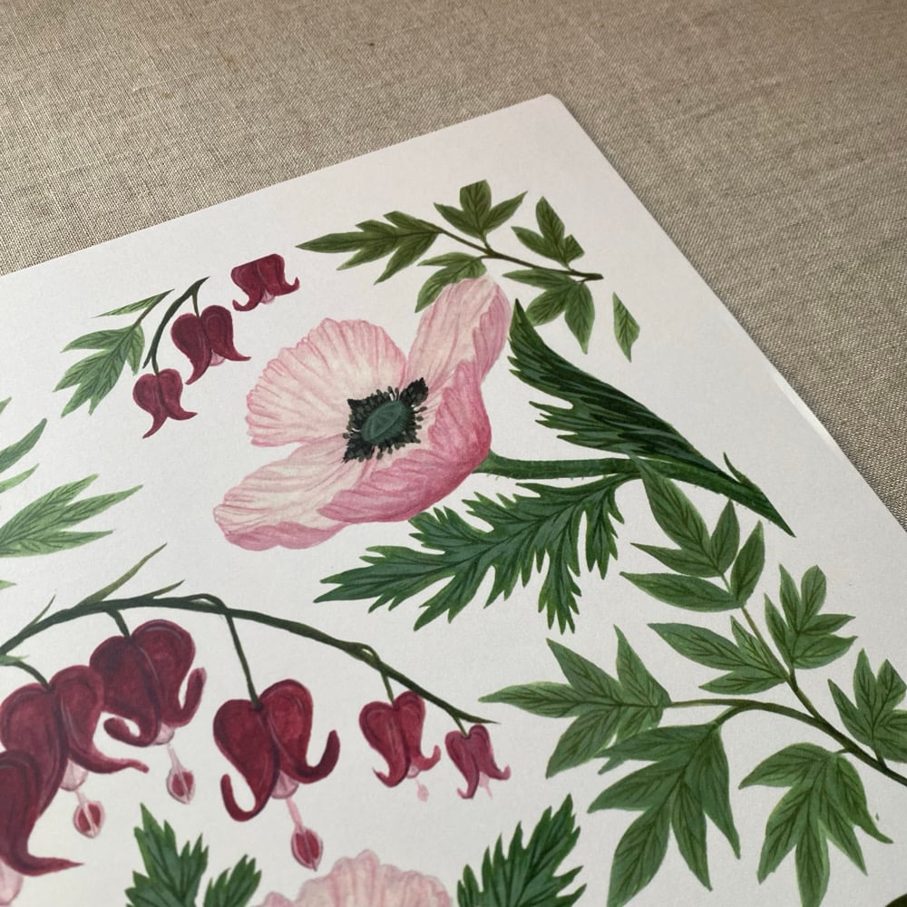 Poppies & Bleeding Hearts is a hand-painted gouache artwork, created in Lancashire and inspired by the poppies and bleeding hearts growing in my garden. The piece captures the colours and shapes of these plants as they flourish in spring and early summer.